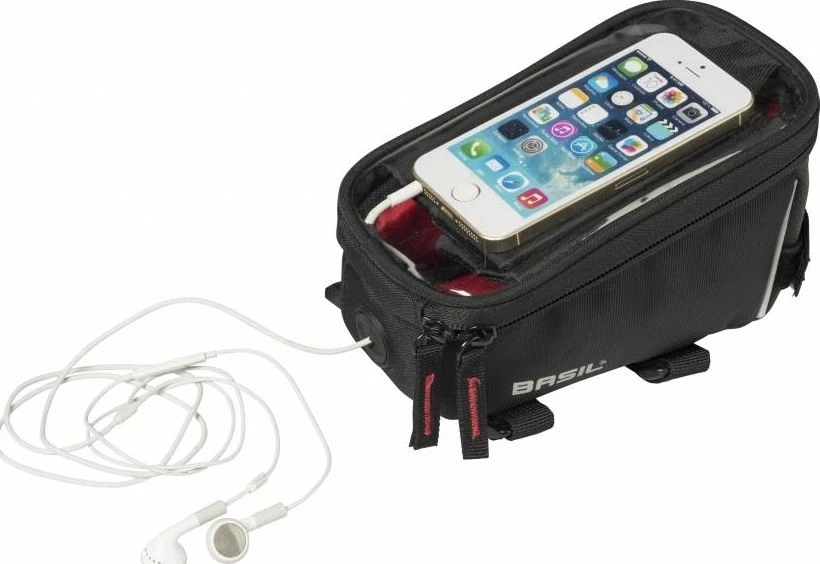 De Basil Sport Design Frame Bag is een praktische frametas die je bevestigt bovenop je bovenbuis. Een frametas wordt vaak gebruikt om je smartphone in te stoppen. In het grote vak kun je je sleutels, voedingsreep en andere kleine benodigdheden kwijt. De frametas is gemaakt van waterafstotend polyester en bevestig je aan het frame met behulp van klittenband. Met een inhoud van 1 liter is er voldoende ruimte om je smartphone met een scherm tot en met 5.5 inch op te bergen.
