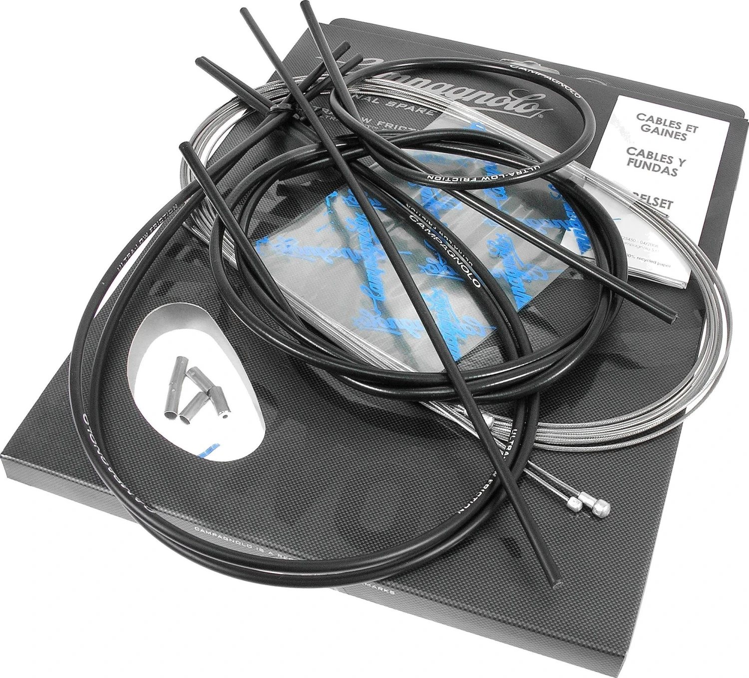 Complete set kabels voor Campagnolo 10 en 11-speed groepen vanaf 2009. Inclusief binnenkabels, buitenkabels en remhoedjes voor derailleurs en remmen.