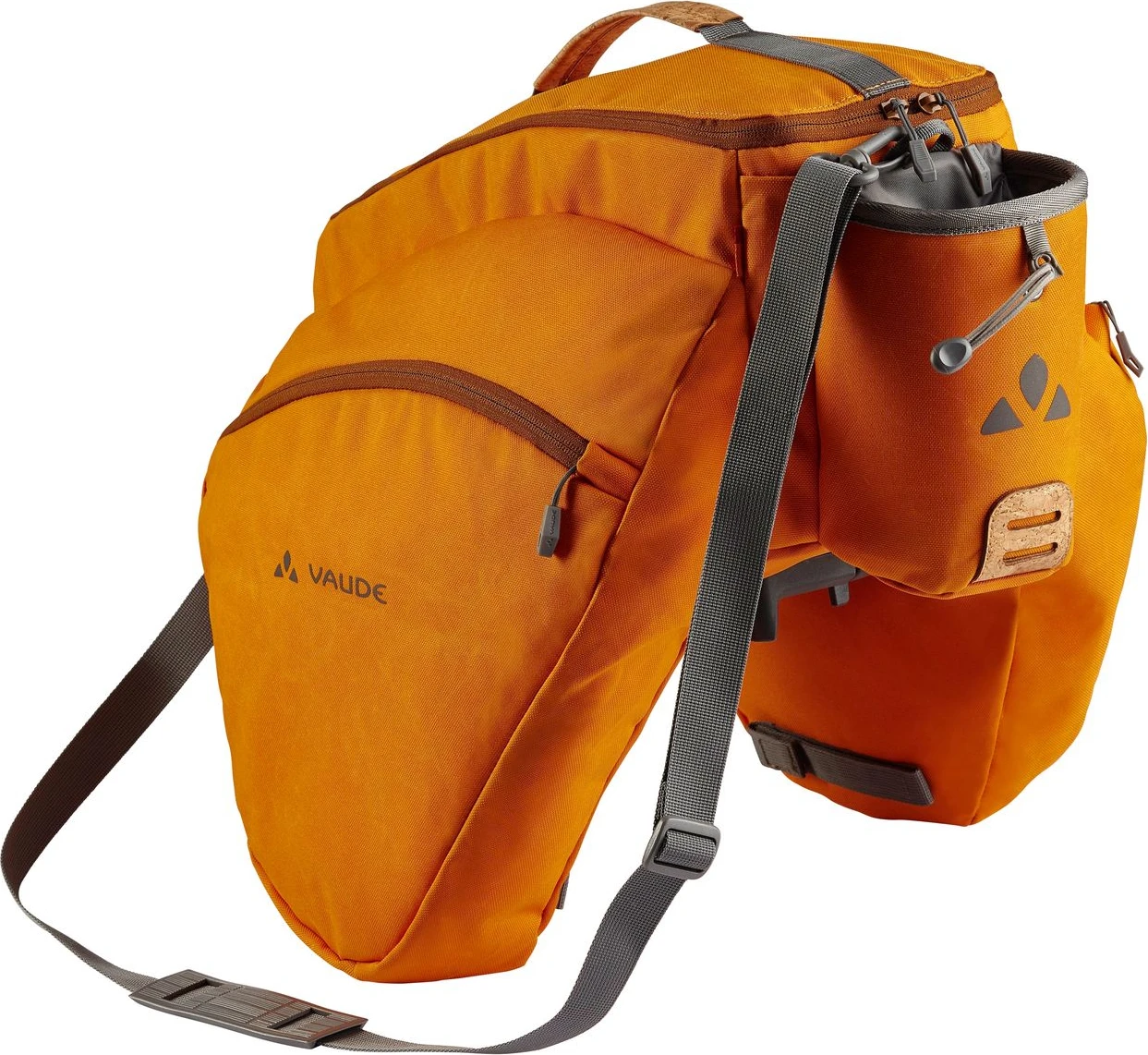 De Vaude E-Silkroad Dubbele Fietstas is speciaal ontworpen voor op de e-bike. De tas beschikt over een groot vak met ritssluiting aan de bovenzijde, waarin je bijvoorbeeld extra kleding mee kunt nemen. De beide zijvakken bieden veel ruimte voor bijvoorbeeld eten en er is ook een extra vak voor een bidon of drinkfles. De tas is voorzien van een afneembare schouderband, een bevestiging voor een achterlicht en reflecterende elementen, waarmee je extra goed zichtbaar bent. De tas heeft een handig UniKlip bevestigingssysteem, waardoor de tas gemakkelijk op de fiets te zetten is. Daarnaast heeft de E-Silkroad ook een accubevestiging. De patches van kurk, die geplaatst zijn bij het handvat en bij de lichtbevestiging voelen prettig aan en vallen goed op.